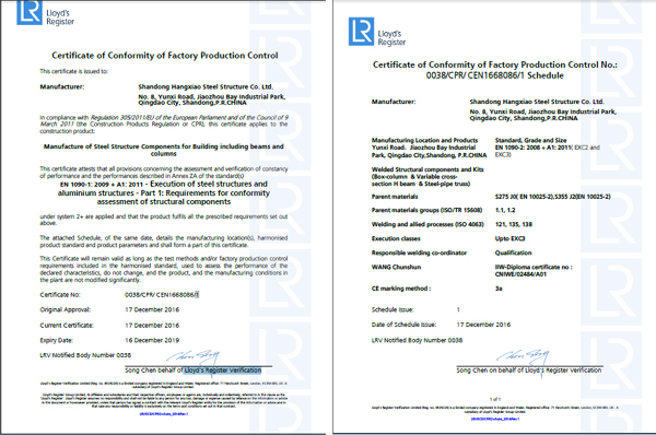 12月20日,山东杭萧钢构有限公司正式收到了劳氏认证(Lloyd’s?Register?Verification)颁发的欧标EN1090质量管理体系认证(EXC3等级)证书,正式通过了该质量管理体系认证。自此,山东杭萧生产的钢结构产品有了进入欧盟市场的通行证。