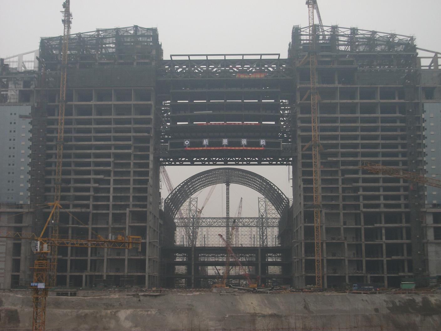??? 成都新世纪环球中心东二区连廊——屋面桁架、16-18层钢框架、13-14层桁架,总重量5700吨。 13层梁最低处标高59.1米,屋面桁架梁顶标高105.2米,共计高度46.1米,为国内重量最大、高度最高的连廊。