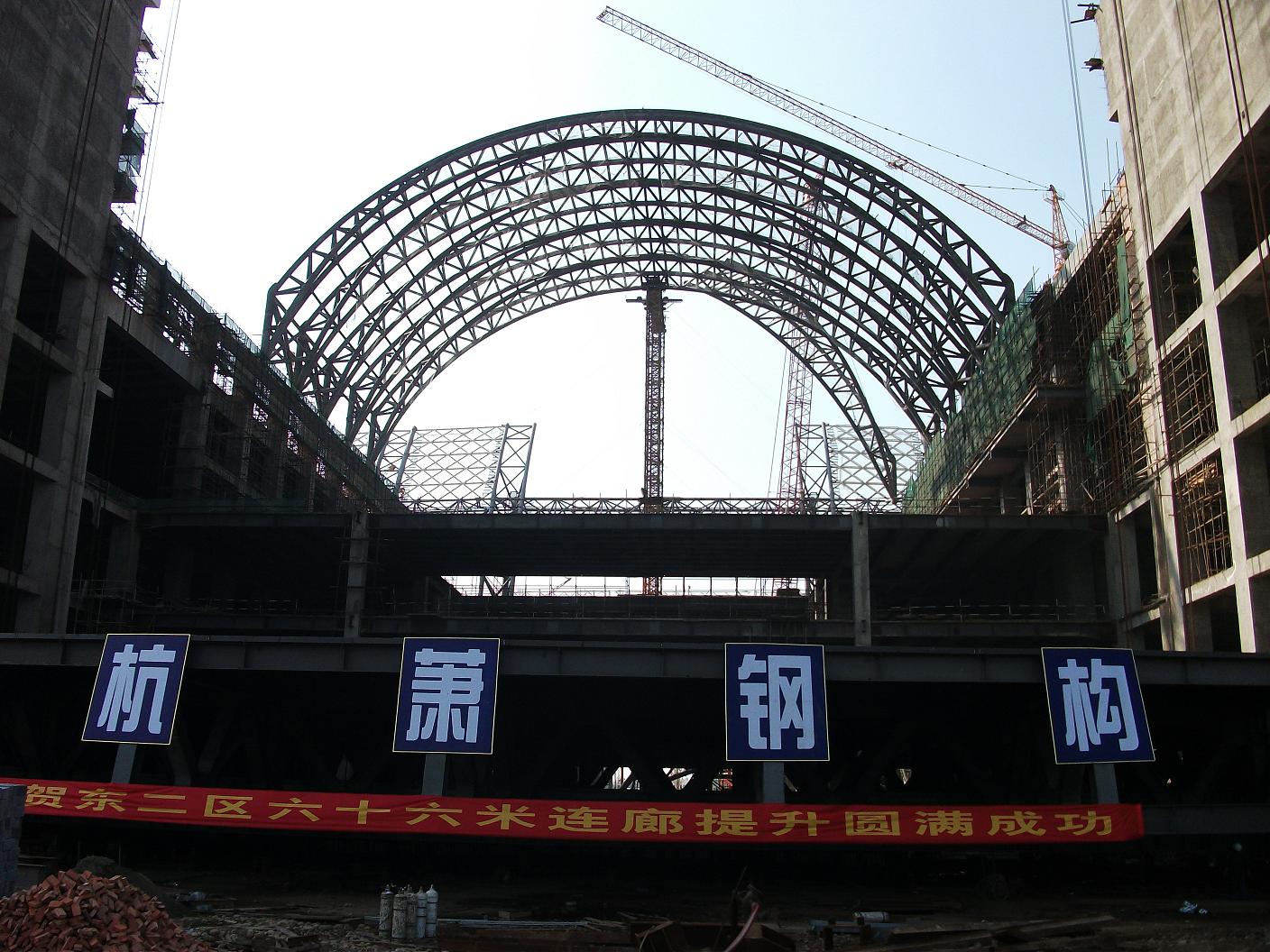 ??? 成都新世纪环球中心东二区13-14层连廊桁架于2011年11月9日试提成功,于2011年11月10日上午9:00正式提升,下午16:30时提升到位。13-14层连廊桁架重量1300吨,在16-18层钢框架2011年10月5日提升完成后,于2011年11月5日全部具备提升条件,全部拼装用时30天,由于业主增加13层马道,故提升时间变更为2011年11月10日。