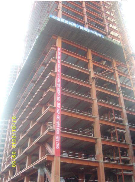 该项目地上部分于2011年6月28日开始施工,在2012年1月7日完成结构封顶。结构工期提前2个月完成。项目所有施工人员克服重重困难,从10月份中旬开始24小时施工,达到10天1节柱的安装速度(1节柱带3层梁),在公司的兄弟部门的全力支持下,保证构件及时制作和运输,保障了现场的施工提速。在1月7日的鞭炮声中,所有项目参建人员的心血都没有白费,尤其感谢公司制作系统兄弟们的支持。